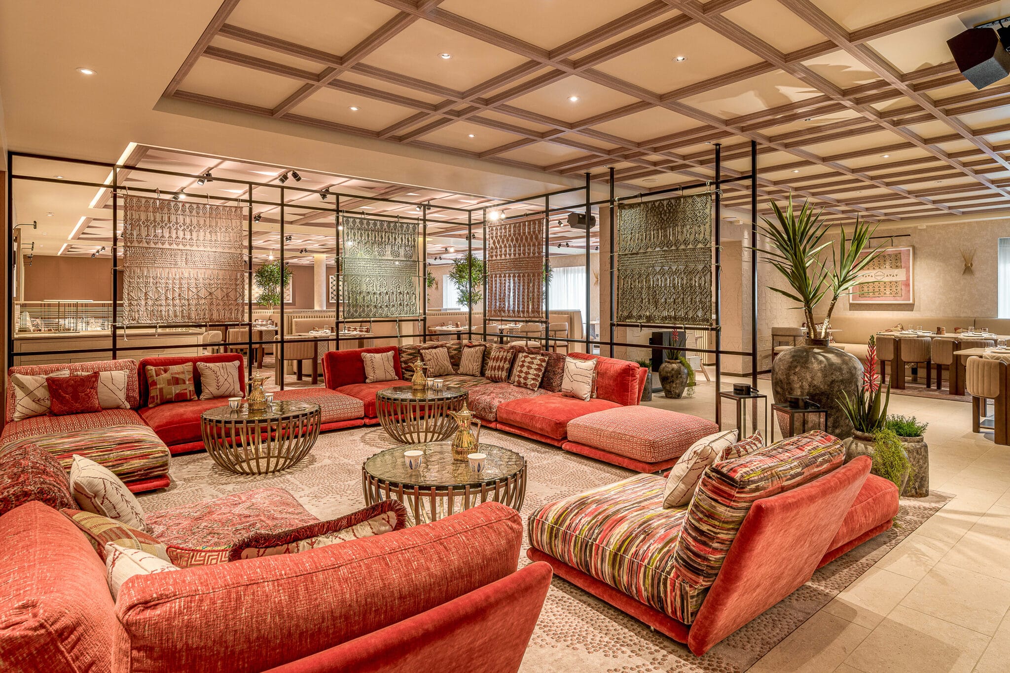 Boutiques, gourmet restaurants, and cafés are unified beneath a striking digital ceiling chandelier, programmed to transition from vivid desert sunrises to atmospheric Arabian nights. This evolving lighting feature creates a fully immersive environment, reinforcing a sense of place while guiding passengers through the space.
