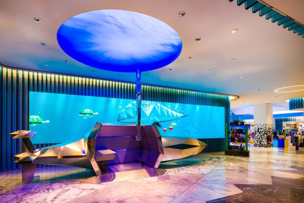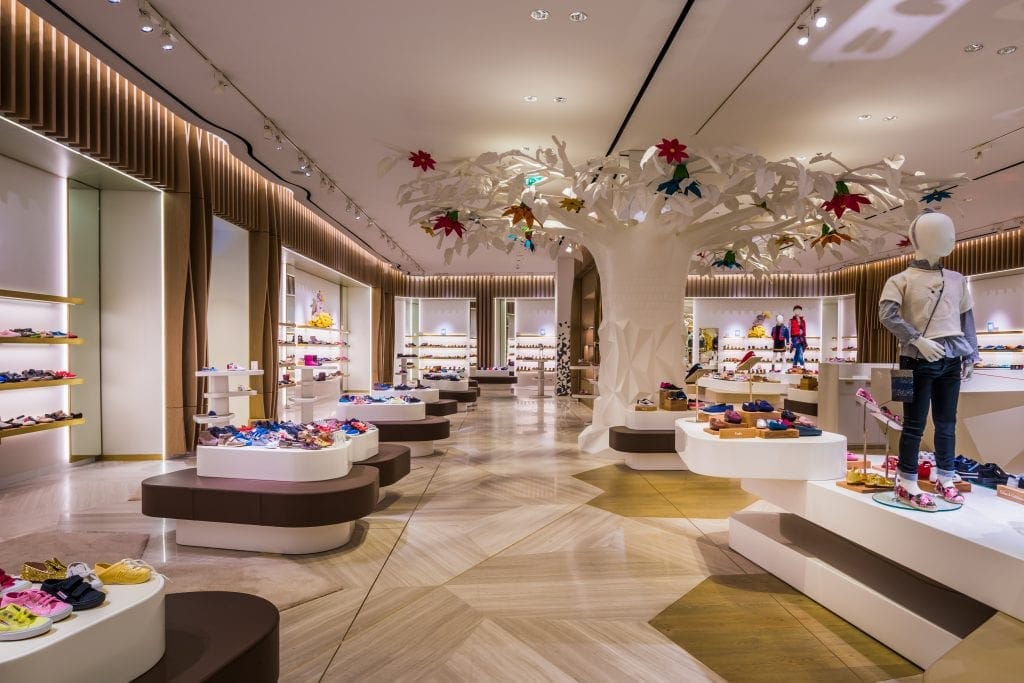 Level Kids is a unique concept and a universe for parent and child. Upon entering, the guest is taken on a sensorial retail journey starting from the ground floor being ‘the crystalline waters’, first floor being a ‘flowering desert’ and second being an ‘enchanted sky’. These are enhanced by several special feature areas: ‘enchanted walkway’; ‘skywalk’, ‘shoe safari’ and a number of unique ‘icons’.  Additionally extensive use is made of media screens, with bespoke content developed by KIN design London, and back-illuminated ceilings.  The lighting design is integrated with, and re-inforces, these diverse elements.