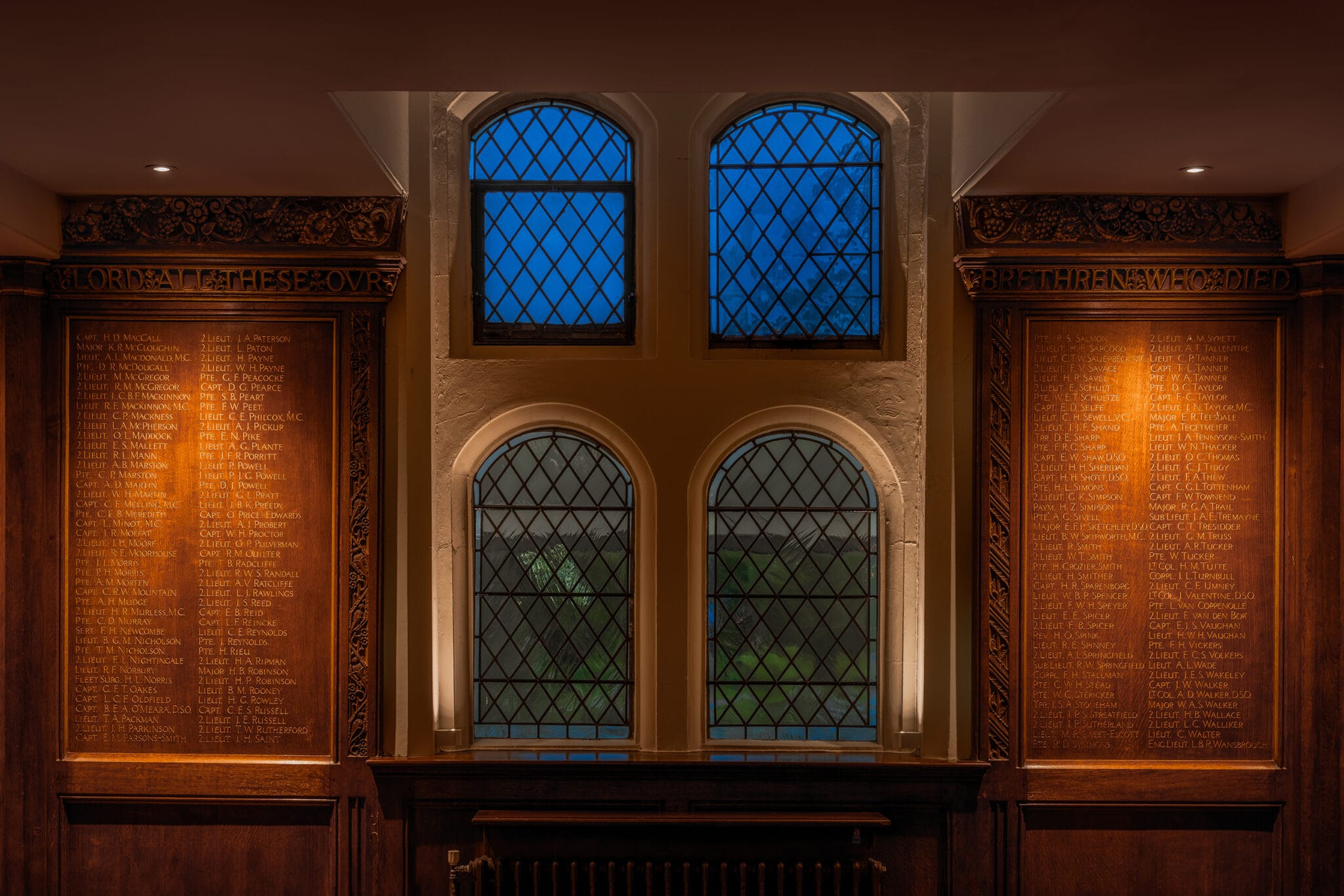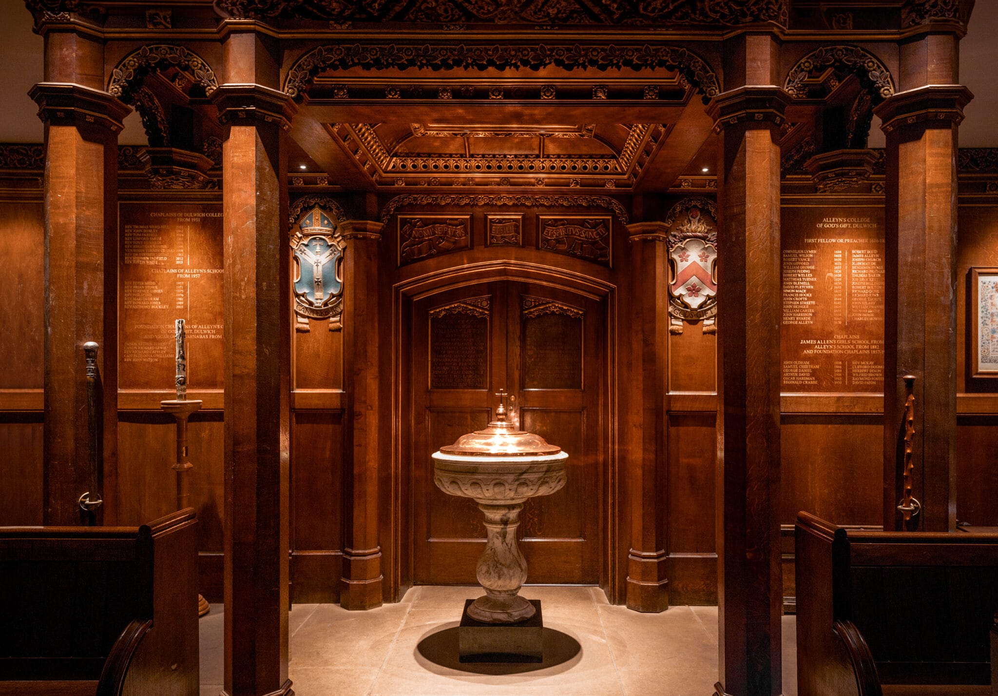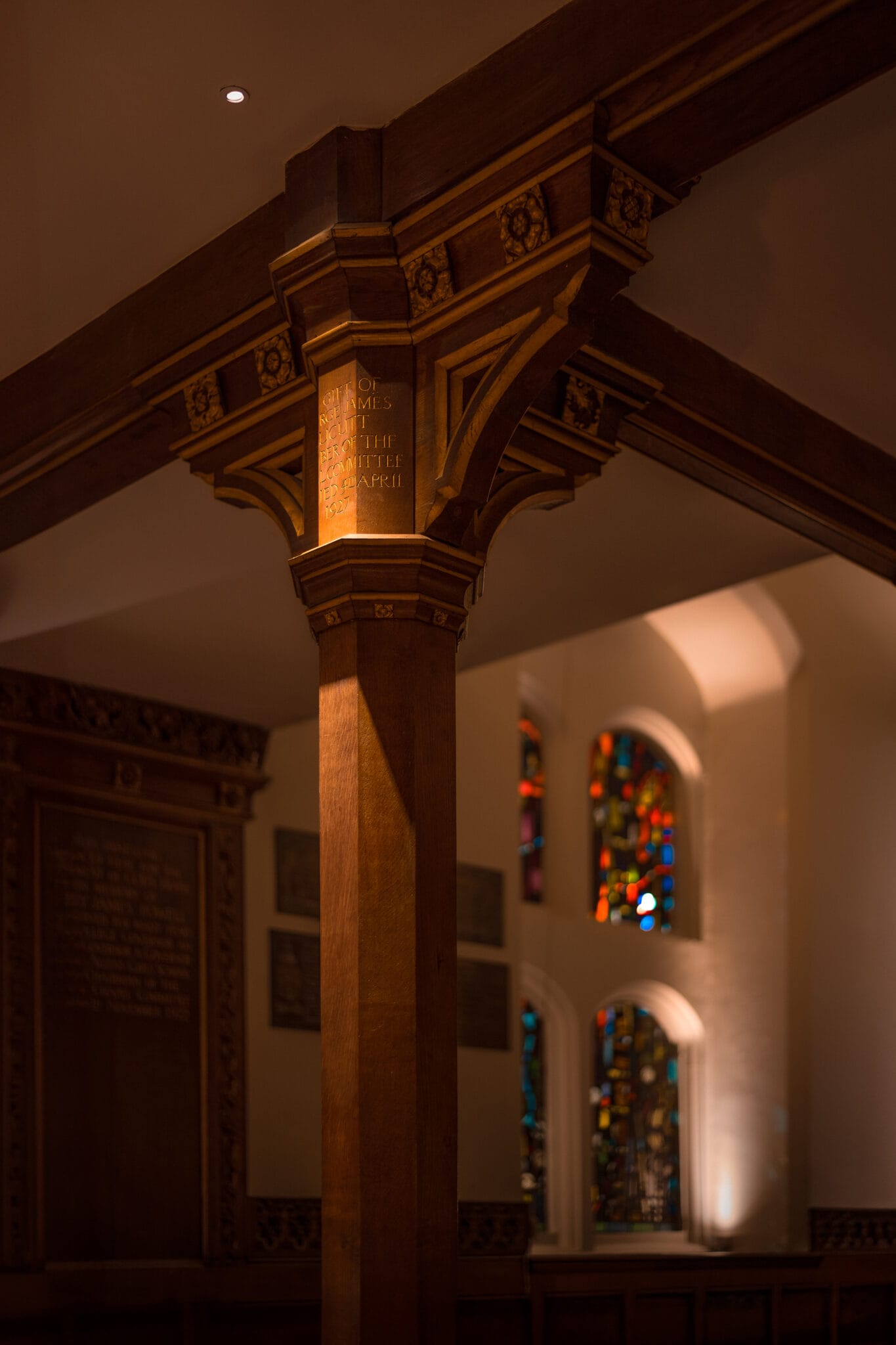 Recessed downlights were used to illuminate feature plaques along the perimeter, while miniature lighting fixtures were installed to focus attention to the decorative shields and central font at the rear of the chapel.