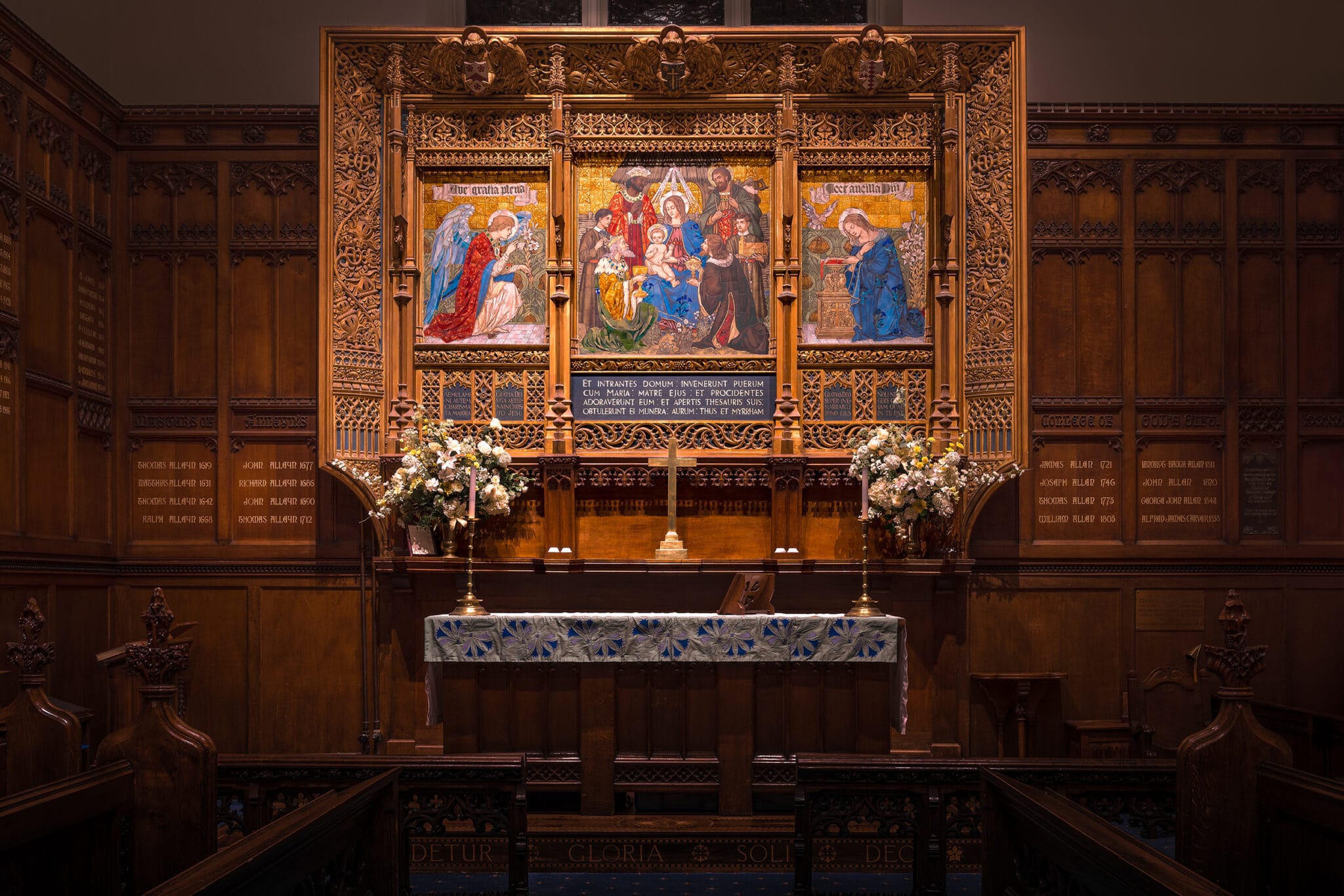 High-level track-mounted spotlights were strategically placed to offer a discreet yet flexible and functional lighting solution for the altar. Simultaneously, these spotlights accentuated the decorative reredos, serving as a focal point in the chancel area of the chapel.