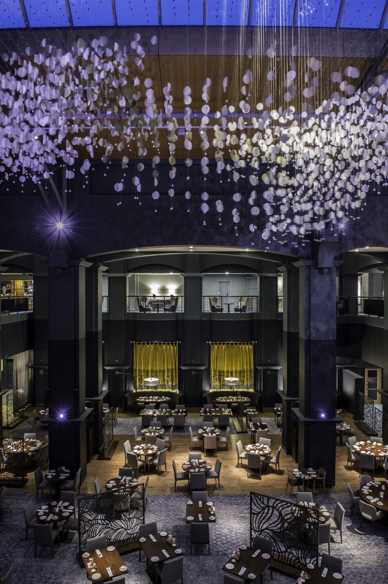 The guest experience has significantly changed with a moody and thoughtful interior embracing rich materials, furniture, and artwork. The lighting responds by accenting the interesting features and concealing lighting to expose interest, depth, and drama from the hotel entry to the restaurant atrium. Within the 50M atrium, the key feature is the Zephyr Chandelier by George Singer (meaning soft gentle breeze) which fills the space with soft kinetics and shadows created by layers of lighting from both above and below. Colour has been utilised for parties and events as the Atrium doubles as a huge event space when not used as a Restaurant and Lounge.