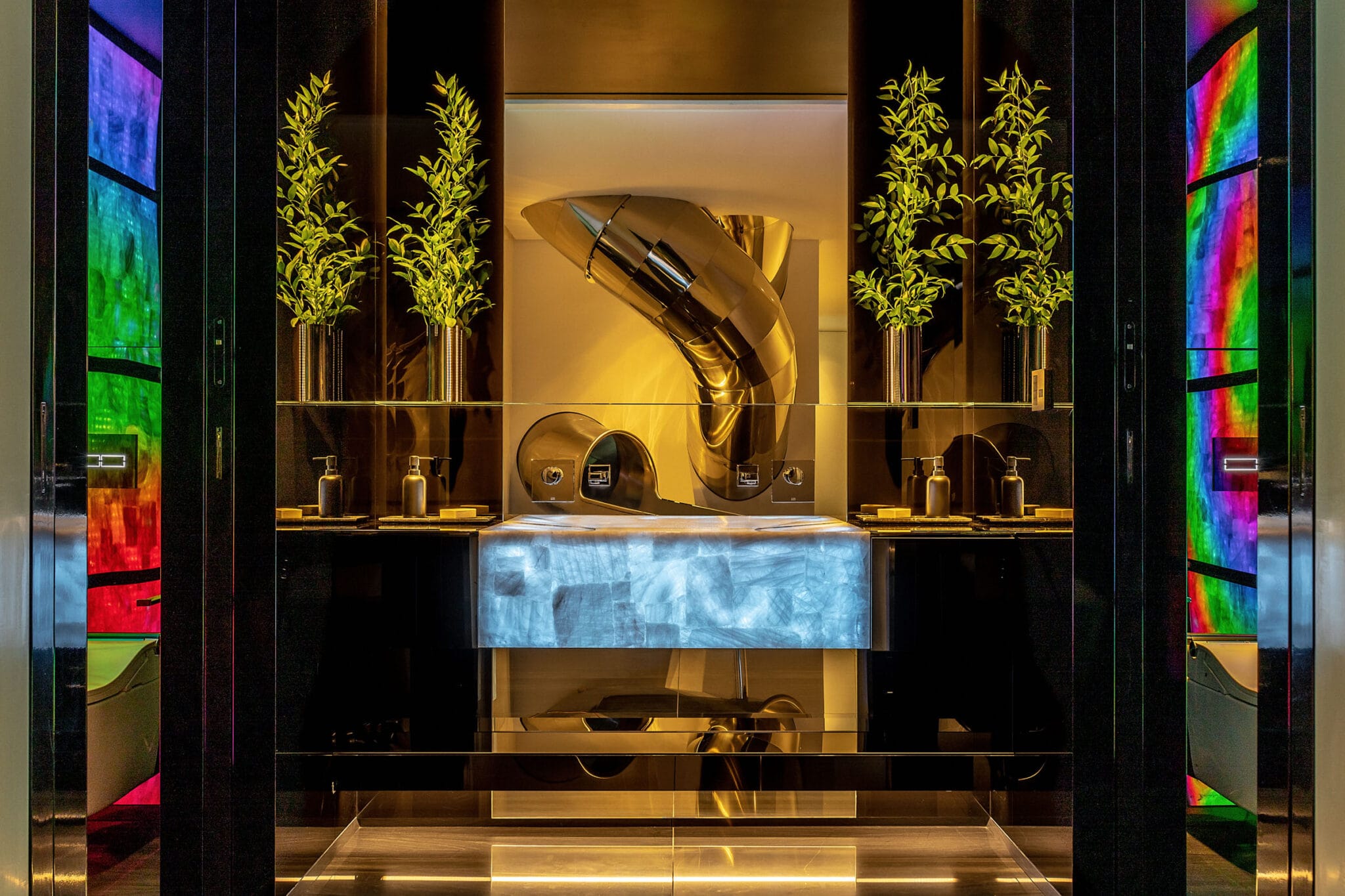 In close collaboration with the Client and design team, the innovative smart home by SMC delivers a family home filled with surprising lighting elements to reflect the families personality and playfulness, whilst also responding to the open plan architecture and extension of the living space into the courtyards and landscaped gardens. Unexpected lighting elements, such as backlit onyx walls, and a twinkly green wall are all programmable from an app, allowing the family to create personalised patterns and flashing light sequences.