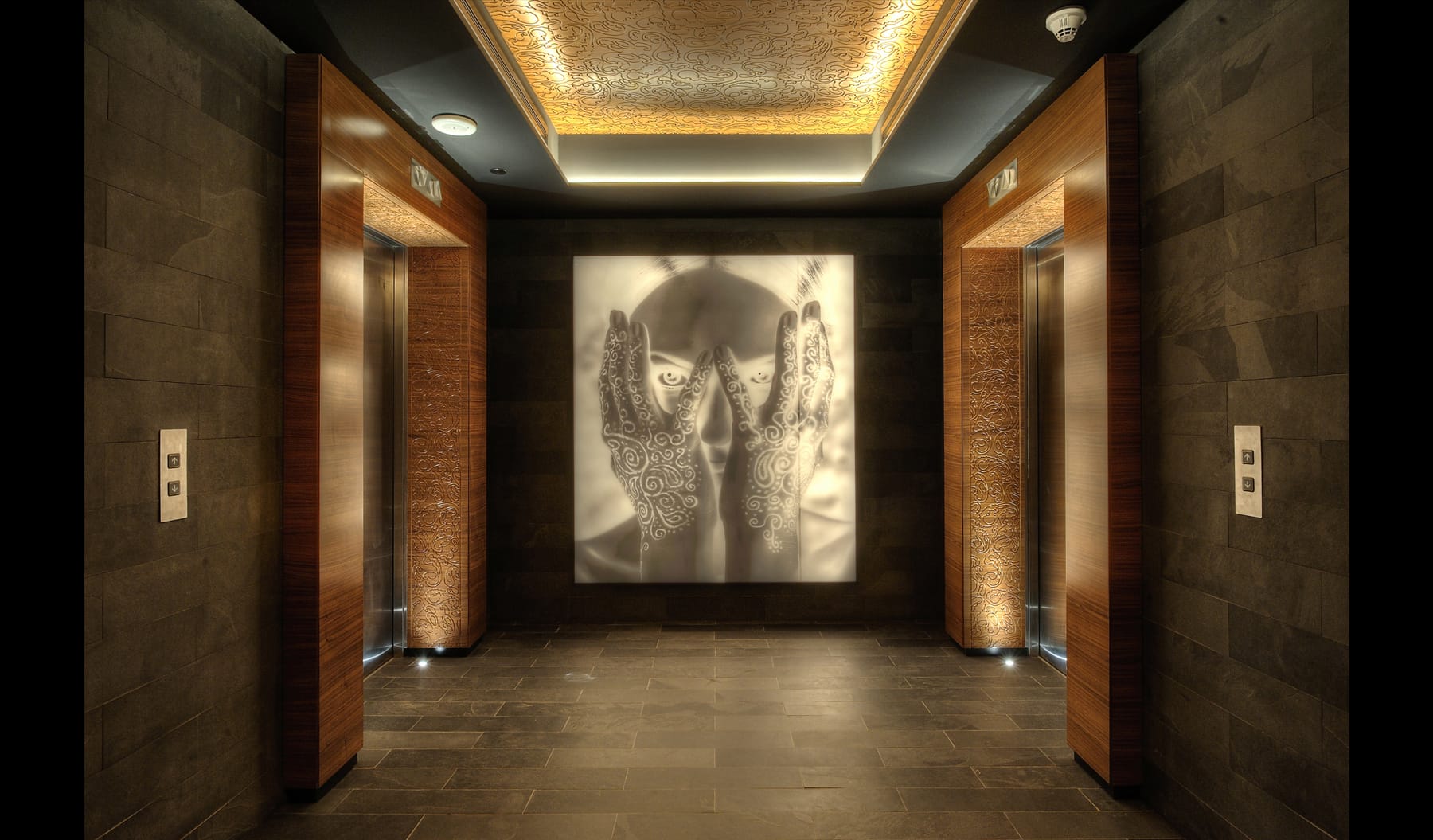 The intricate petals of the high ceiling have been emphasised with linear LED and within their recessed slots, spotlights have been concealed from direct view to keep the ceiling as clean as possible. Concealed lighting and a high number of discreet uplights have been installed throughout to highlight the beauty in the details. Hanging seating chairs have been accentuated by the use of miniature downlights. The evenly backlit bar counter and large graphic panels provide focal points and scale to the space. Carefully chosen decorative light fixtures give the interior ambience its individual touch.