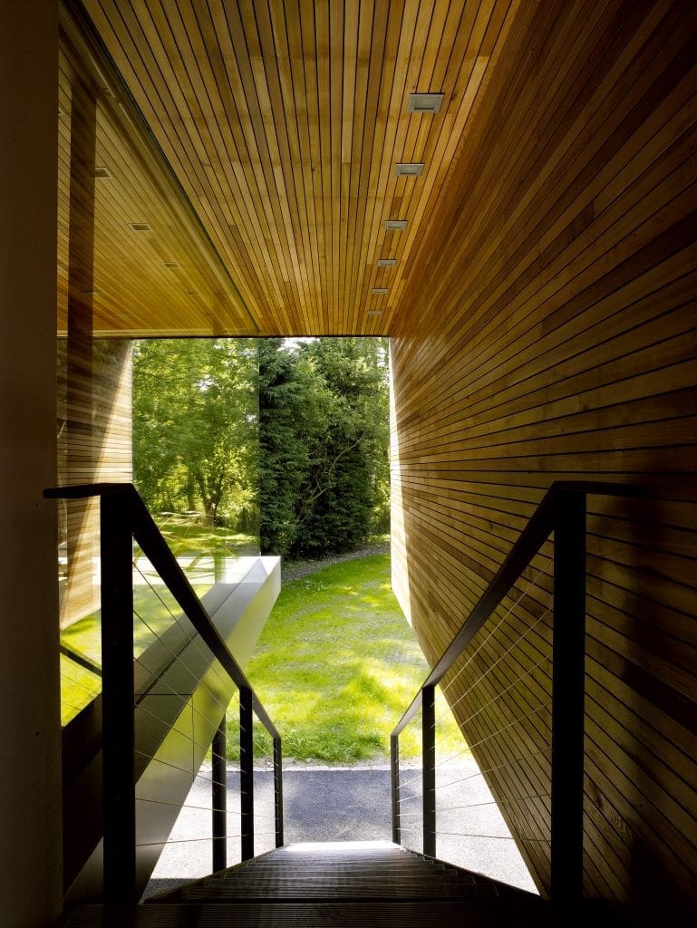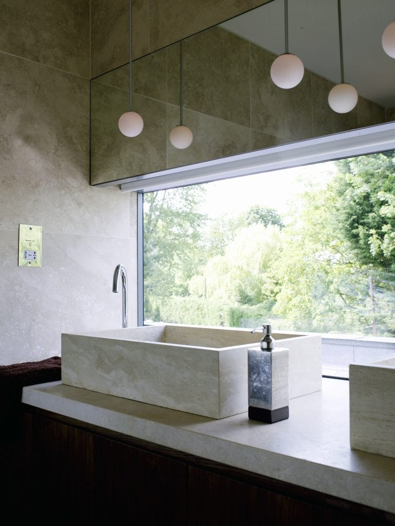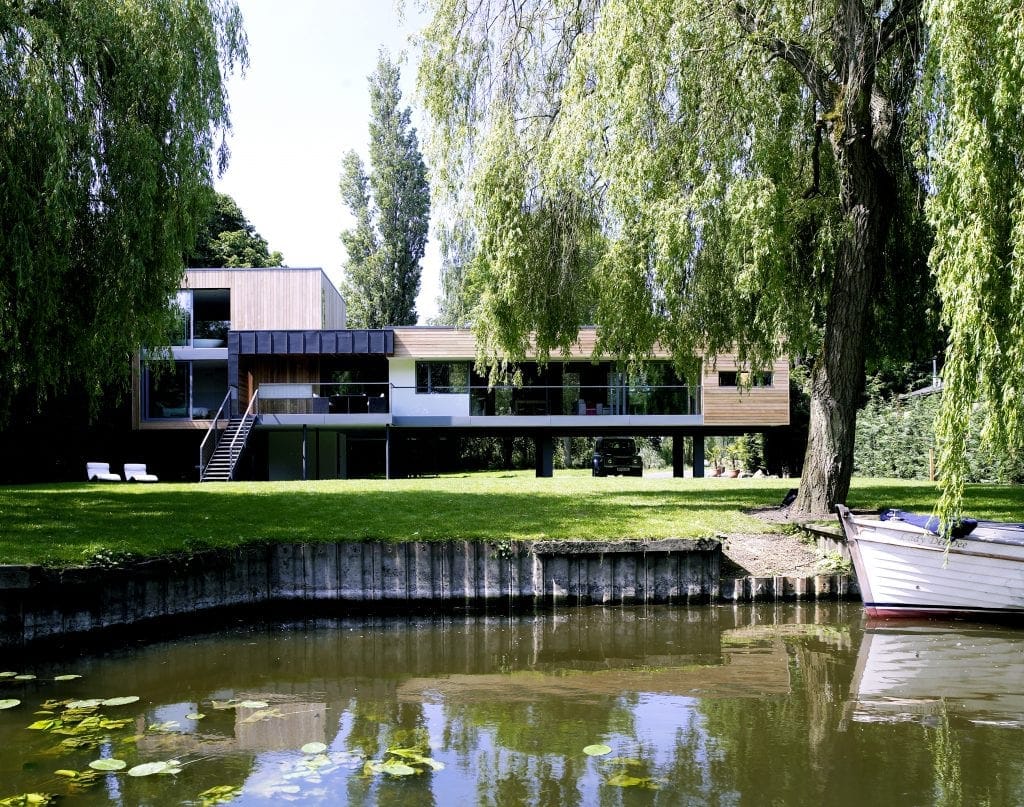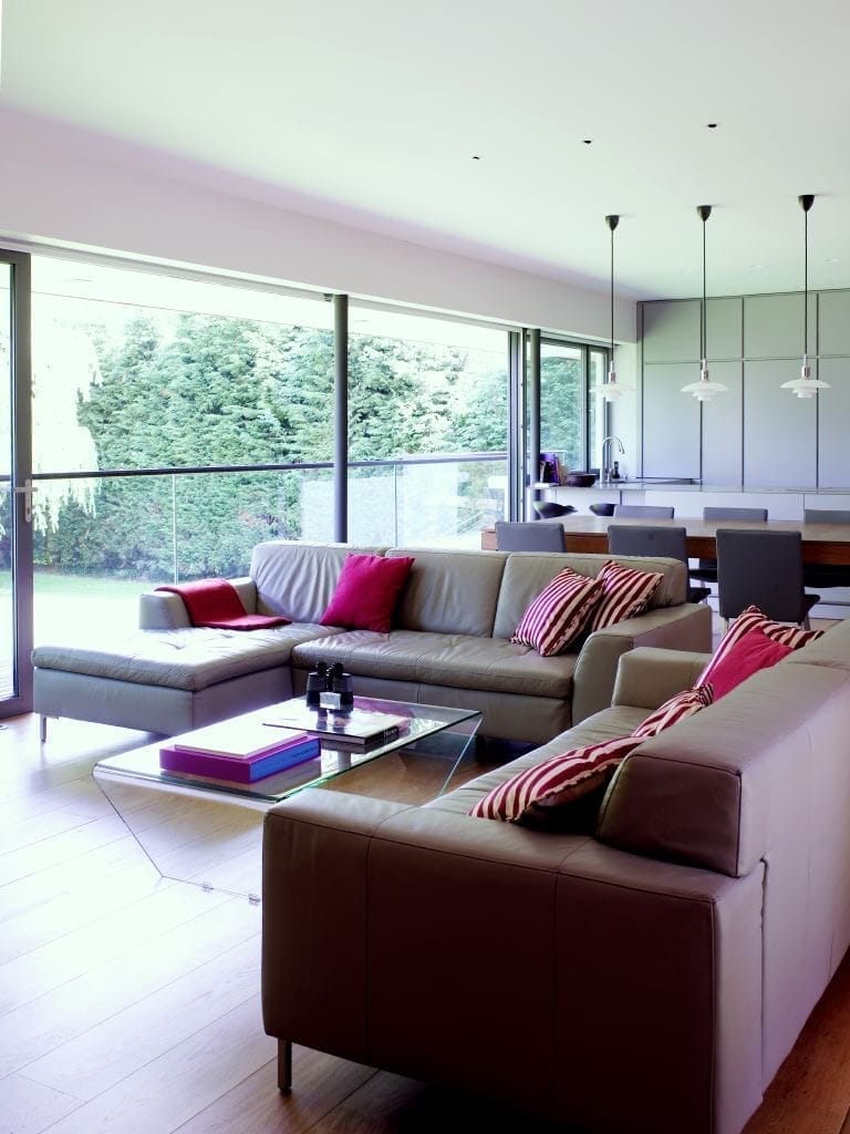 The floor to ceiling glazing offers beautiful views across the river during the day, whilst at night, the view of the externally lit garden can be enjoyed from a lit and dimmed interior, without the distraction of reflections of light sources in the glass.