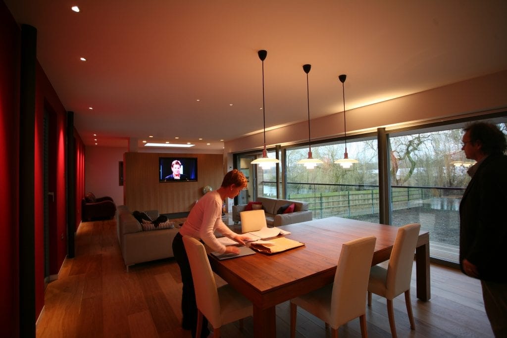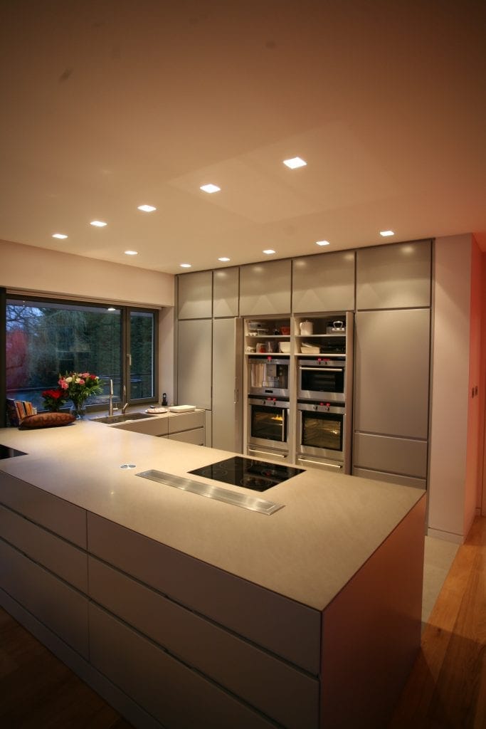 The lighting of the open plan living space allows different areas within the room to be emphasised with light according to the activity being carried out. At the touch of a button, the lighting emphasis can be switched from the Dining Table to the Kitchen and then onto the Lounge area.
