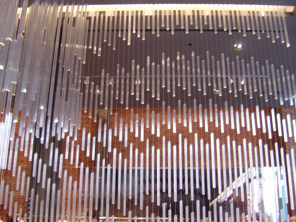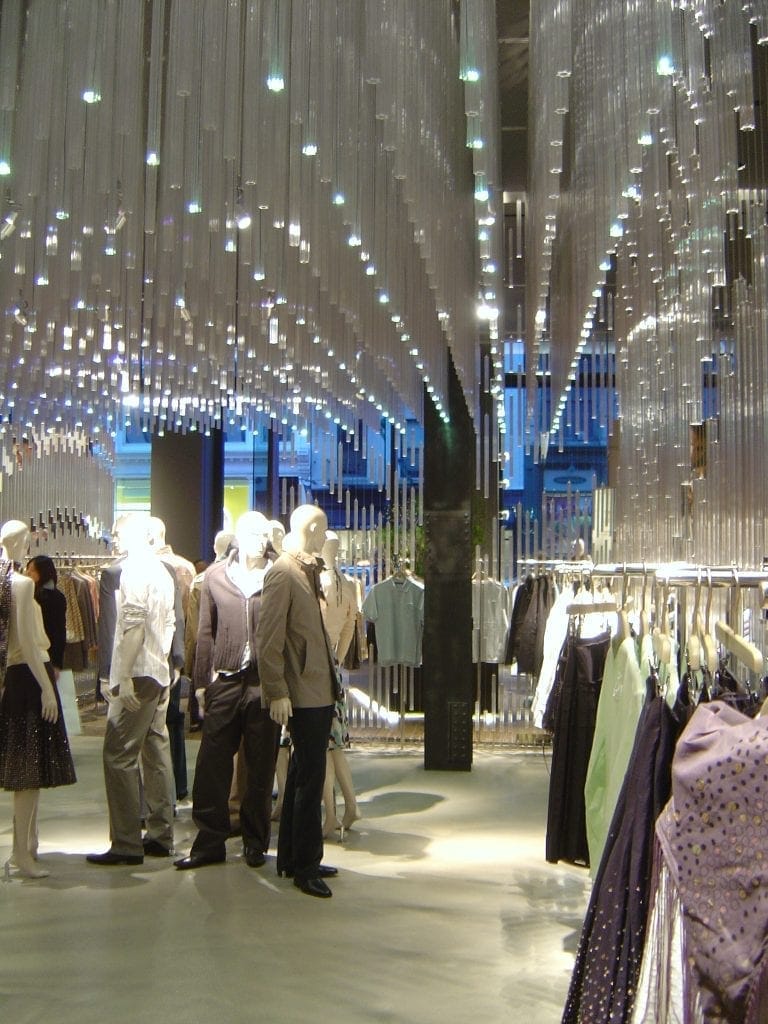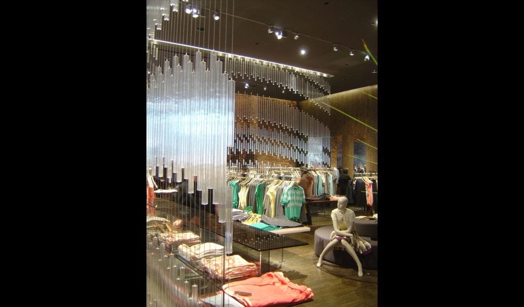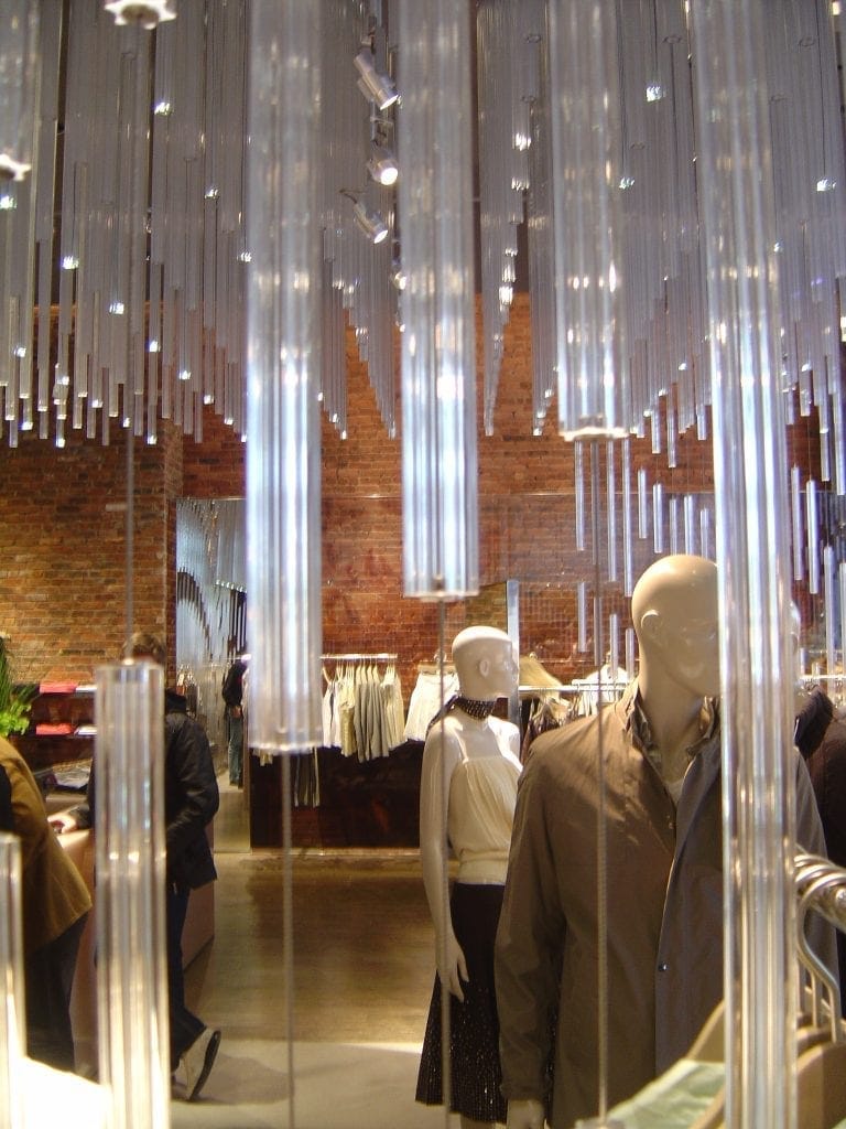 Located on West Broadway in SOHO, the Reiss Store is a large internal space with generous ceiling height. The interior concept was for an industrial shell with high quality insertions. Hence, the walls are bare-faced brick and the floor is concrete. The ceiling is finished dark and a combination of bare metal finish track and spot and trimless adjustable downlights provide ambient and display lighting. All light sources are metal halide to cater for the ceiling heights and energy efficiency. The central feature of the store is a large hanging cube chandelier which is lit using fibre optics to slowly shimmer. This feature is further surrounded by glass screens which are lit to sparkle and glow. This breaks up the openness of the store and provides visual interest.