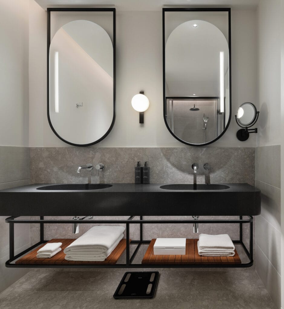 The food and beverage offerings within the hotel include LAVO, a sophisticated Italian restaurant with coastal flair, from Tao Group Hospitality, along with the vibrant The BoTree Bar by Concrete Amsterdam. LAVO’s sumptuous and delightful interior is warm in both materials and light throughout. The inviting booths are framed by a feature backlit wall spanning over both floors of LAVO with softly lit greenery and bespoke decorative lighting. The BoTree Bar provides a vibrant space that transforms from day to night through an illuminated colour-changing light feature that spans across the ceiling. The teal marble bar curves across the space with a backdrop of illuminated bottles and curated artworks on display.