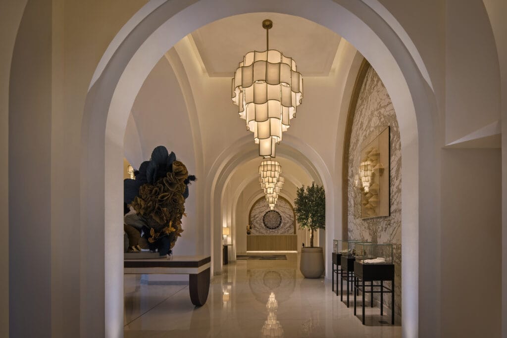 The ship’s interior spaces were meticulously redesigned by the design team to reflect the region’s rich cultural heritage, seamlessly integrated with modern luxury. At the heart of AROYA is the breathtaking three-deck atrium and galleries adorned with historical artefacts and bespoke kinetic lighting sculptures. This vibrant space features boutiques, gourmet restaurants, and cafés beneath a digital ceiling chandelier that transitions from vivid desert sunrises to enchanting Arabian nights, creating a dynamic and immersive atmosphere.